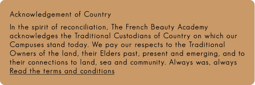 In the spirit of reconciliation, The French Beauty Academy acknowledges the Traditional Custodians of Country on which our Campuses stand today. We pay our respects to the Traditional Owners of the land, their Elders past, present and emerging, and to their connections to land, sea and community. Always was, always
