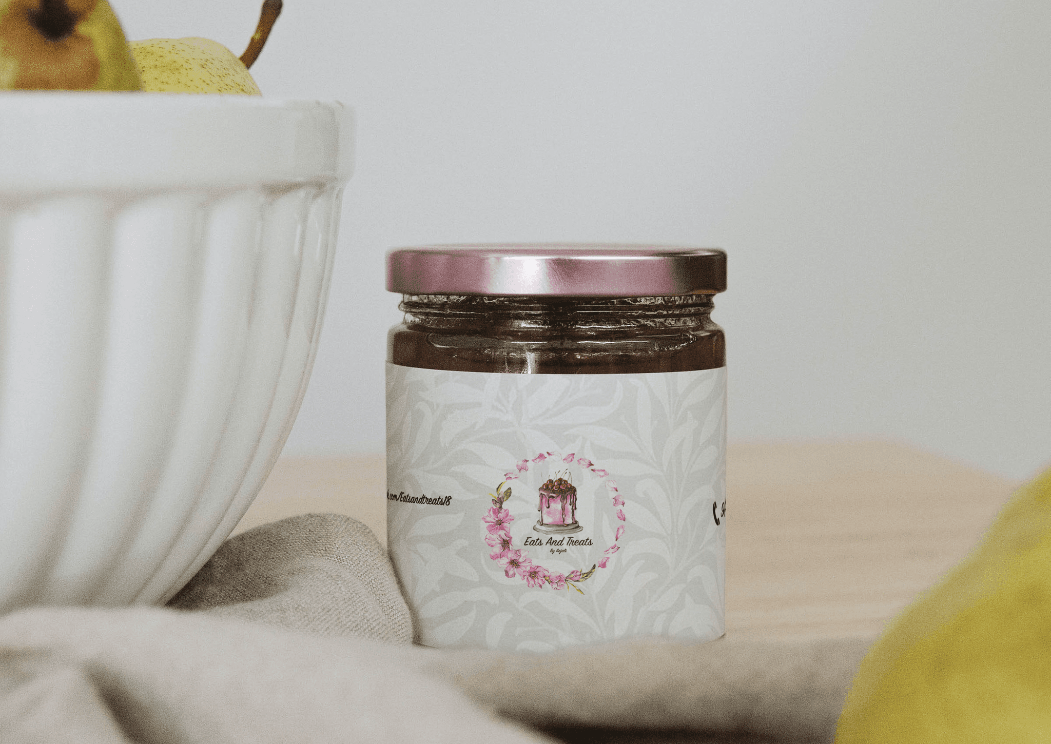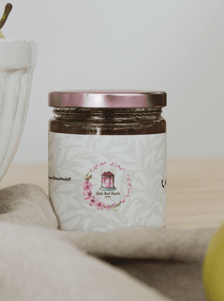This concept for Eats and Treats by Anjali uses a hand-painted cake and floral wreath to reflect the brand’s homemade, artisanal essence. The soft pastel background with leaf patterns adds elegance while maintaining a warm, handcrafted feel. The design is clean, inviting, and ideal for packaging like jam jars and social media presence.